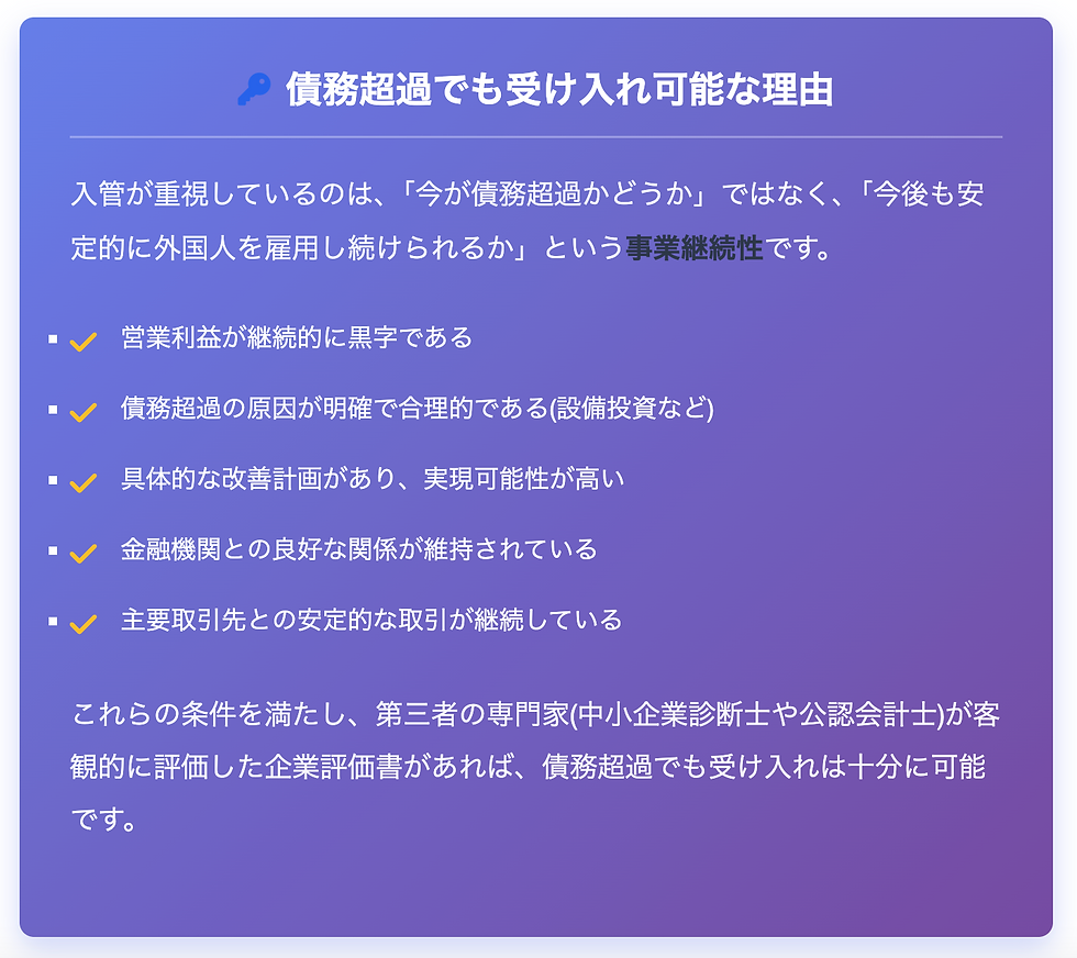 企業評価書がない場合、在留資格申請は原則として不承認となります。逆に言えば、適切な企業評価書があれば、債務超過でも受け入れが認められるのです。