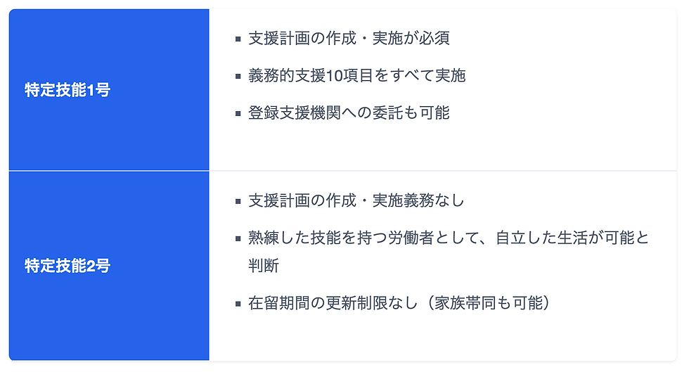 特定技能には「1号」と「2号」の2種類がありますが、支援義務が課されるのは特定技能1号のみです。