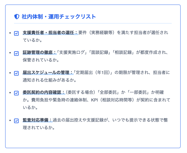 迷ったときは、支援計画10項目を「やり切れる設計」に落とし込み、届出と証跡を仕組み化することがリスク回避の近道です。