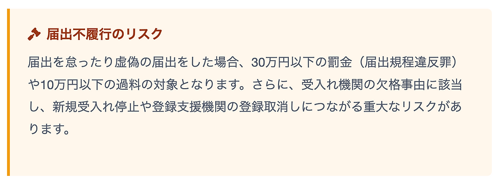 これらの義務を怠ると、行政指導・改善命令の対象となり、最悪の場合は新規受入れ停止や在留資格の更新不許可といった重大なリスクに直面します。