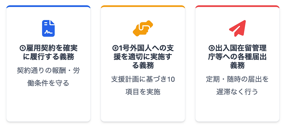 特定技能外国人を受け入れた企業には、大きく分けて3つの法的義務が課されます。この3つが「コンプライアンスの柱」です。