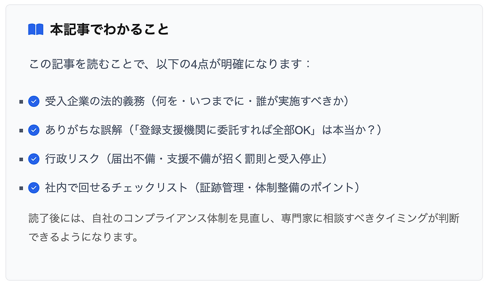 監督責任 | 登録支援機関が適切に支援を実施しているか企業が確認・管理する義務 | 丸投げは不可 |