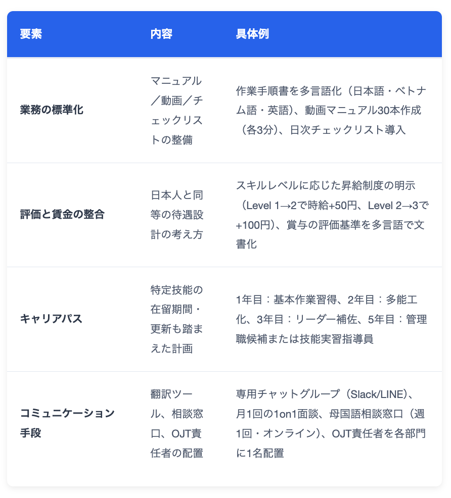 体制 | 受け入れ後の組織設計、責任者の明確化、現場任せにしない運用 | 安定運用と定着率向上 |