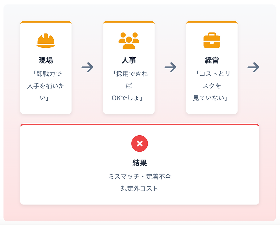 これらのズレが重なると、ミスマッチ・定着不全・想定外のコスト発生という三重苦に陥ります。