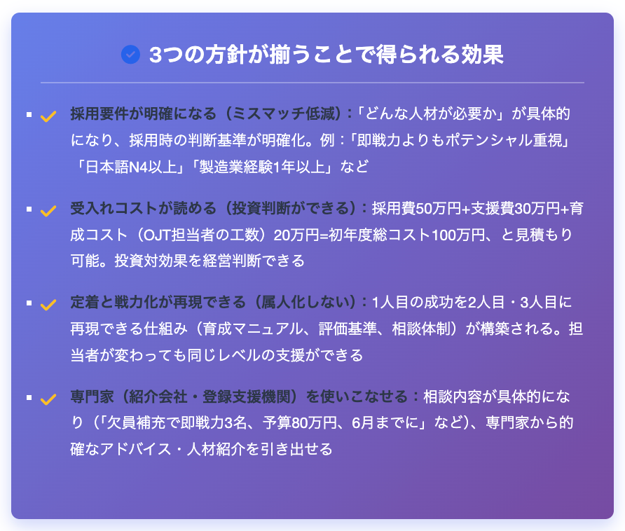 ここまで見てきた「採用目的」「育成ゴール」「組織責任体制」の3つの方針が揃うと、特定技能外国人材の導入は劇的に変わります。