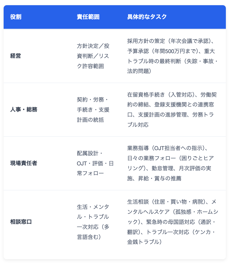 特定技能外国人材の受入れで最も多い失敗パターンは、「担当者がいない」のではなく「責任が分散して誰も動かない」状態です。