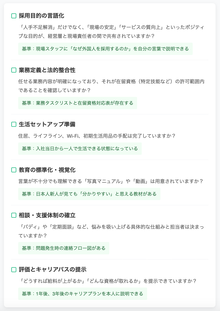 最後に、自社の受け入れ体制が「成功する仕組み」になっているかを確認するためのチェックリストを用意しました。これから採用する企業も、すでに採用している企業も、ぜひ活用してください。